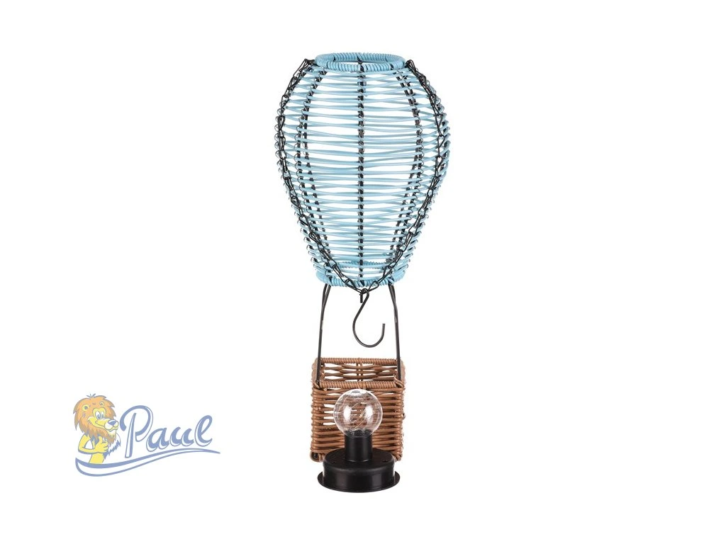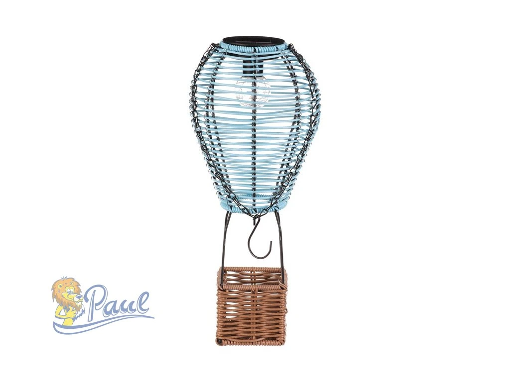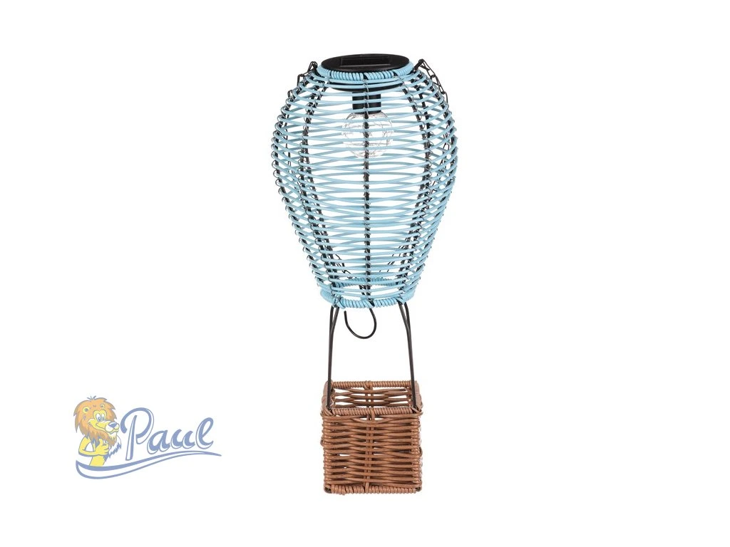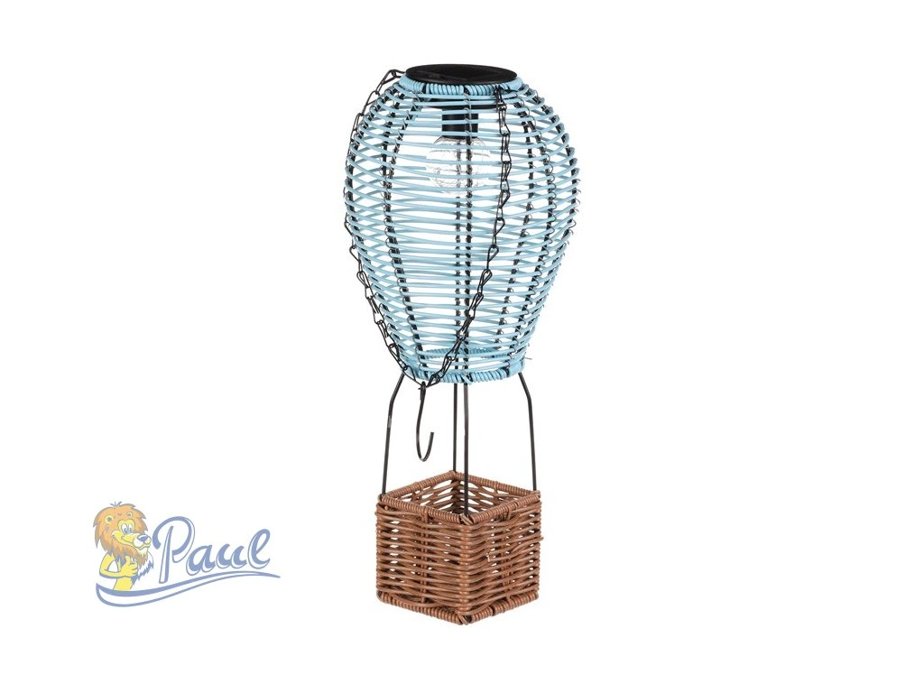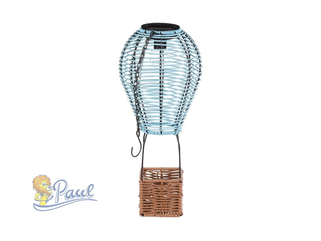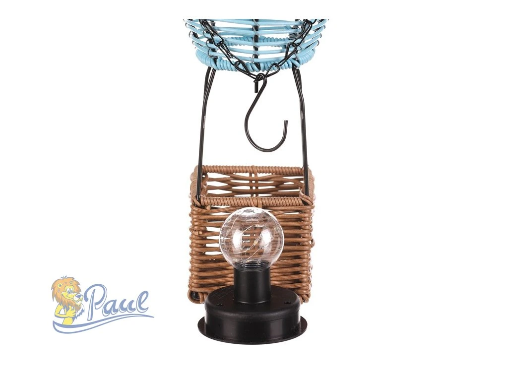 Lampión ve tvaru balónu kombinuje modré polyratanové pruty s hnědou základnou z umělého ratanu a černými kovovými prvky, které tvoří stabilní rám. LED osvětlení uvnitř lampiónu vytváří příjemnou atmosféru a je vhodné pro použití na terase, balkóně nebo v interiéru. Praktický řetízek umožňuje snadné zavěšení nebo přenášení. Velikost L zajišťuje výrazný dekorativní efekt a zároveň dostatečné osvětlení prostoru. LED osvětlení je napájeno 1 x AA dobíjecí baterií a zároveň solárním panelem umístěným na horní hraně.Doplňkové parametry