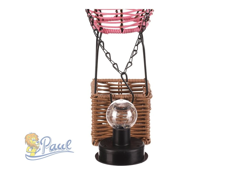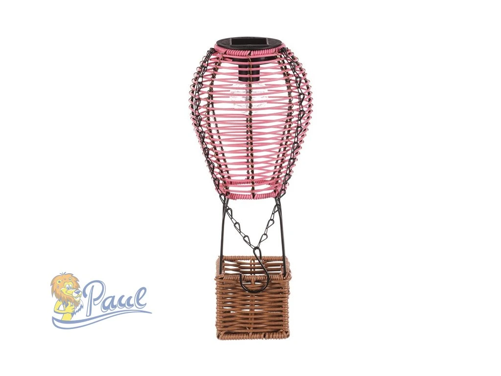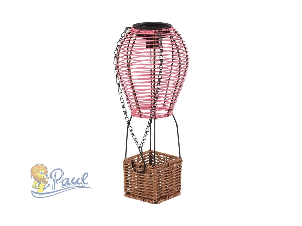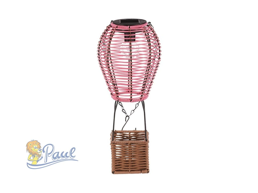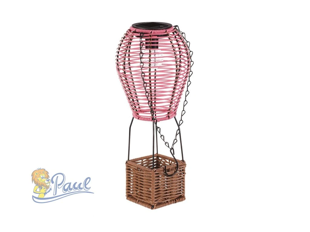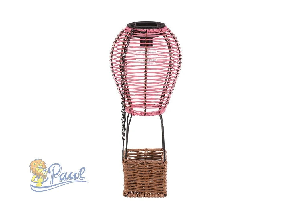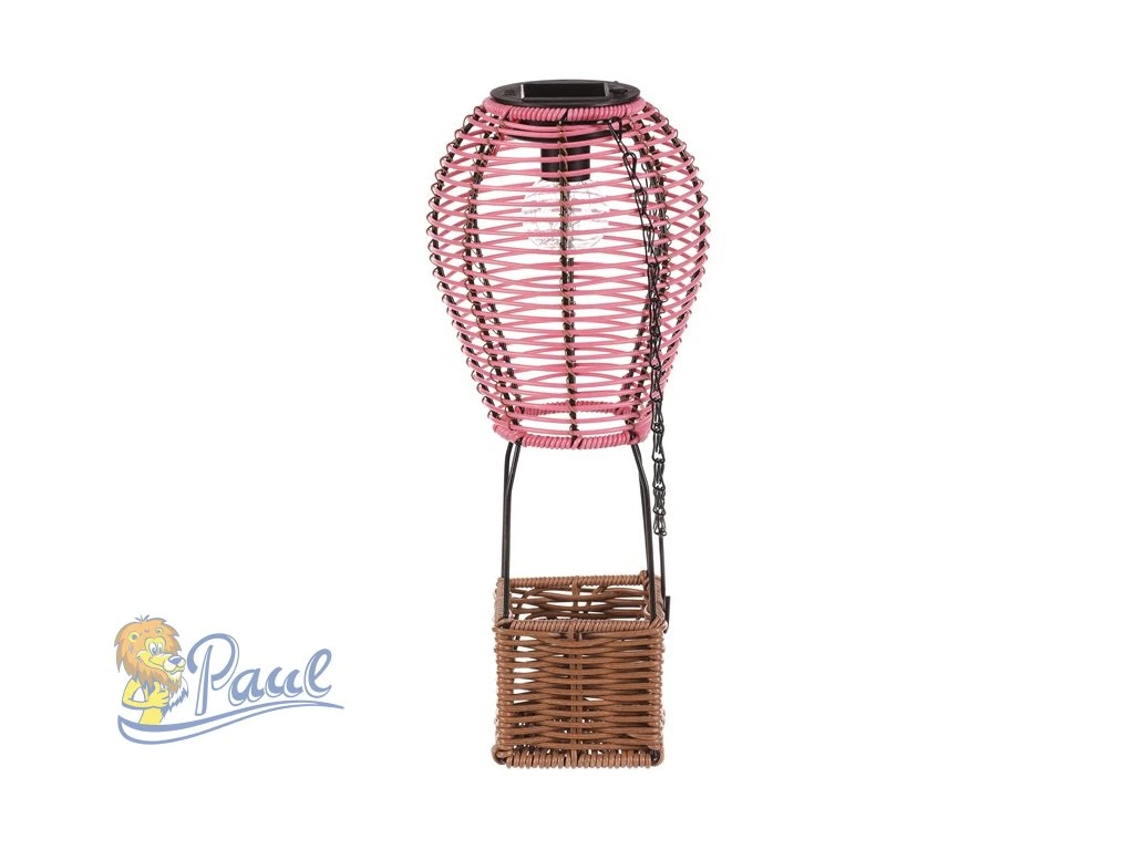 Lampión ve tvaru balónu kombinuje růžové polyratanové pruty s hnědou základnou z umělého ratanu a černými kovovými prvky, které zajišťují stabilitu a možnost zavěšení. LED osvětlení napájené solární energií vytváří příjemnou atmosféru bez potřeby elektrické zásuvky. Díky použitým materiálům je lampión vhodný pro venkovní i vnitřní použití, přičemž polyratanová struktura propouští světlo jemně a dekorativně. Výška a tvar balónu dodávají dekoraci originální vzhled, který vynikne na terase, balkóně nebo v zahradě. Praktický řetízek umožňuje snadné přenášení či zavěšení na háček. LED osvětlení je napájeno 1 x AA dobíjecí baterií a zároveň solárním panelem umístěným na horní hraně.Doplňkové parametry