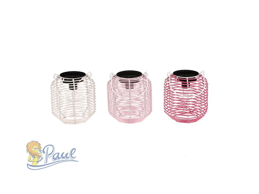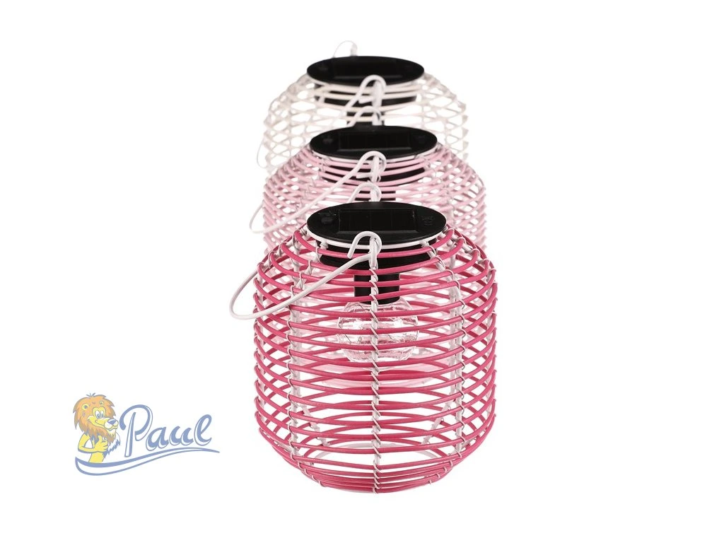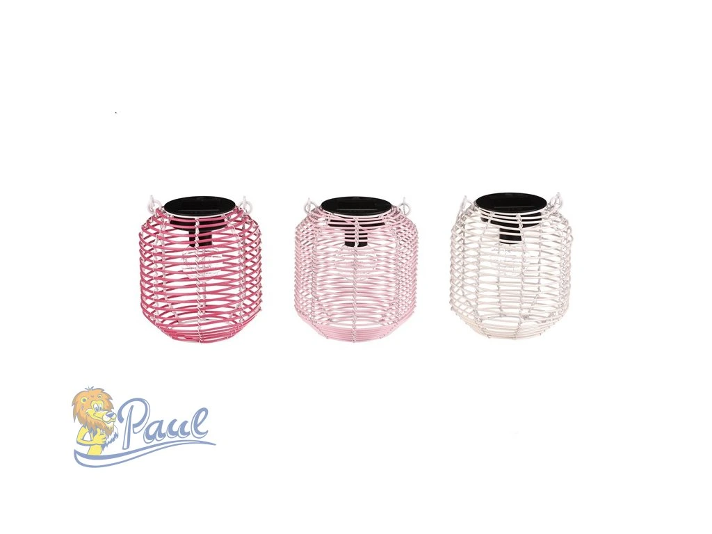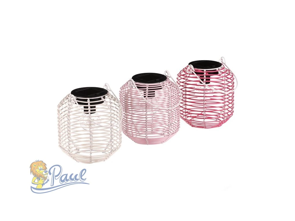 Lampión ve tvaru soudku je vyroben z polyratanu v kombinaci s kovovými prvky a nabízí jemné LED osvětlení. Jeho otevřená struktura umožňuje příjemný světelný efekt, který vytváří útulnou atmosféru. Součástí je praktické kovové ucho pro snadné přenášení nebo zavěšení. Lampión je dostupný ve třech barevných variantách – bílé, světle růžové a tmavě růžové, což umožňuje variabilní použití v interiéru i exteriéru. Díky použitým materiálům se snadno udržuje a je vhodný pro dekorativní osvětlení během večerů. LED osvětlení je napájeno 1 x AA dobíjecí baterií a zároveň solárním panelem umístěným na horní hraně.Doplňkové parametry