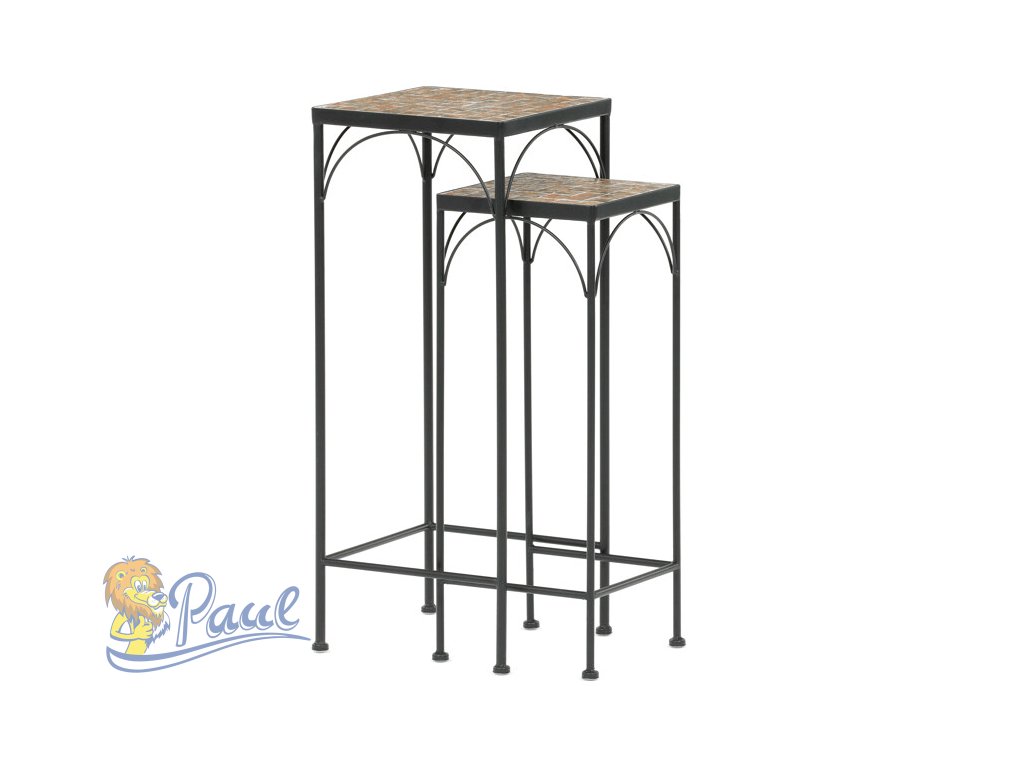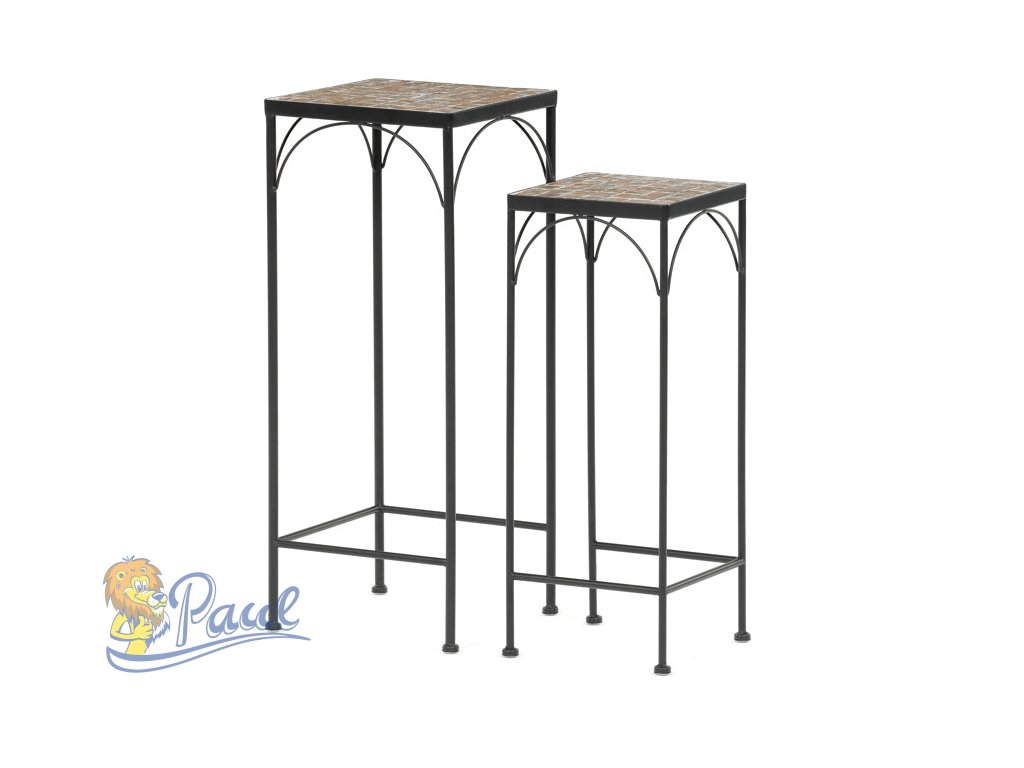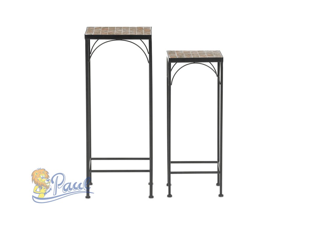 Sada dvou stojanů na květiny s kovovou konstrukcí a deskou z keramické mozaiky v přírodních odstínech přináší do interiéru i exteriéru praktický a dekorativní prvek. Kovové nohy jsou tenké, ale pevné, s decentními obloukovými výztuhami pod deskou, které zvyšují stabilitu a vizuální lehkost. Mozaiková deska je složená z drobných keramických dlaždic, které vytvářejí zajímavý barevný vzor a snadno se udržují. Vyšší a nižší stojan umožňují variabilní uspořádání květin nebo dekorací, čímž se hodí do různých prostorových řešení. Díky kombinaci kovu a keramiky je sada navržena pro dlouhou životnost a snadnou údržbu.Doplňkové parametry