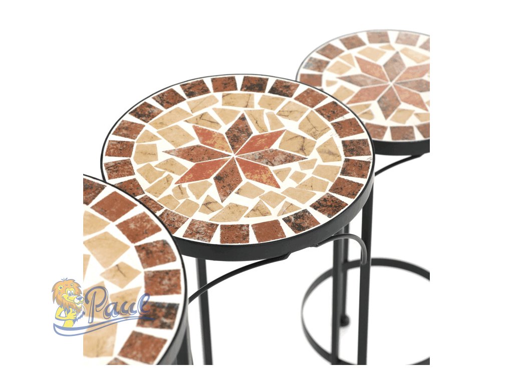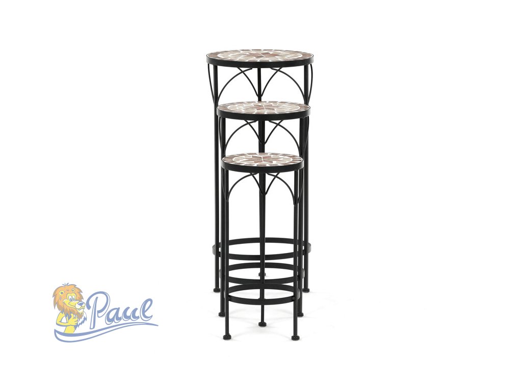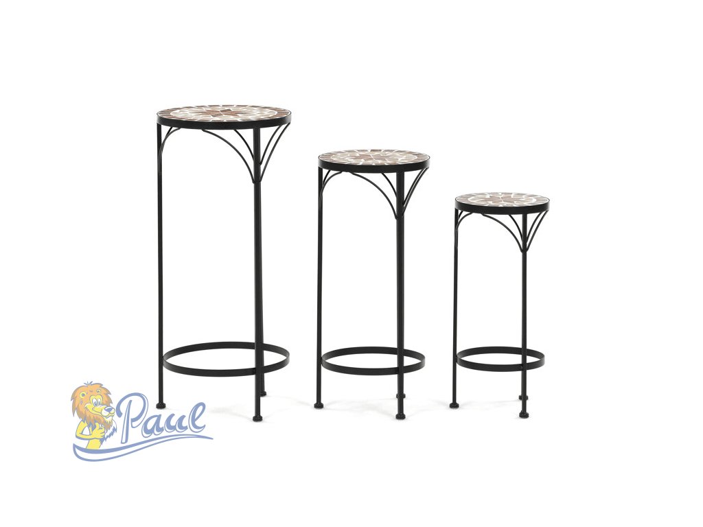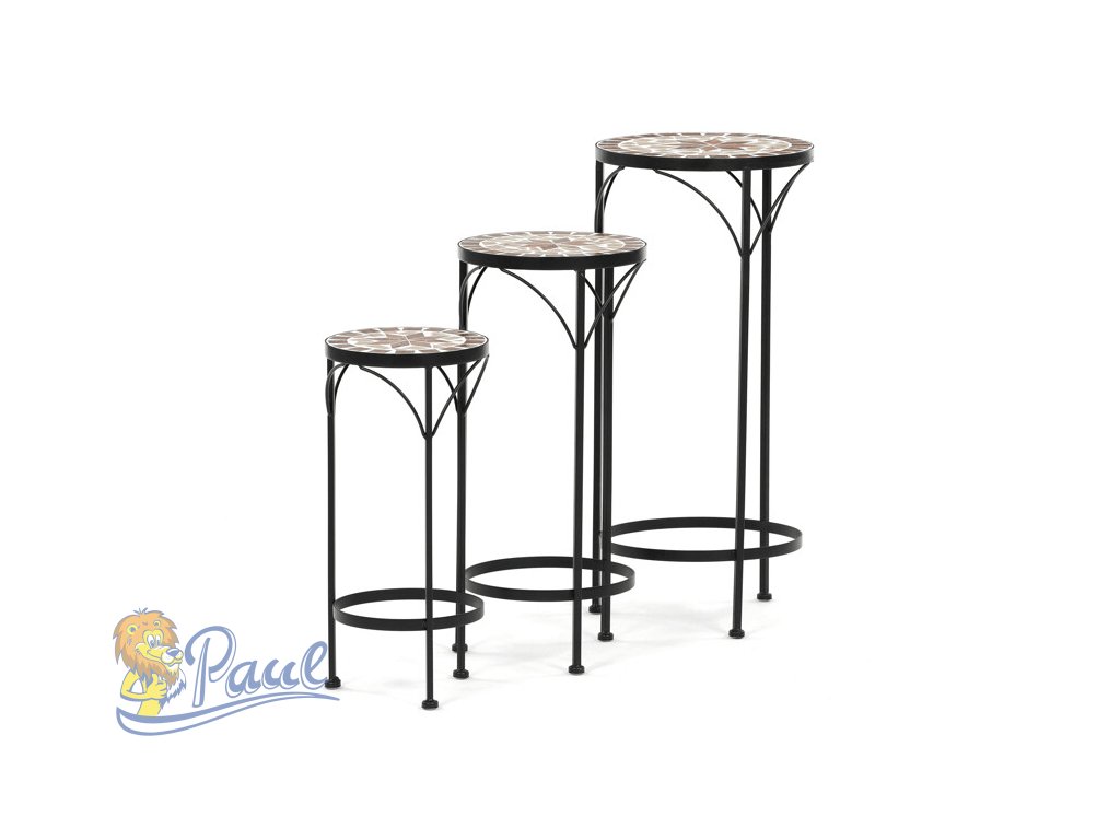 Sada tří stojanů na květiny kombinuje pevnou kovovou podnož s keramickou deskou zdobenou krémovou mozaikou, která vytváří jemný dekorativní prvek. Každý stojan má odlišnou výšku, což umožňuje variabilní uspořádání rostlin a zajímavou prostorovou kompozici. Kovová podnož je navržena pro stabilitu a dlouhou životnost, zatímco keramická deska je snadno udržovatelná a odolná vůči povětrnostním vlivům. Díky elegantnímu spojení materiálů a přírodních odstínů stojany vyniknou jak v interiéru, tak na terase či balkóně. Vhodné pro vystavení květin v různých velikostech a typech nádob.Doplňkové parametry