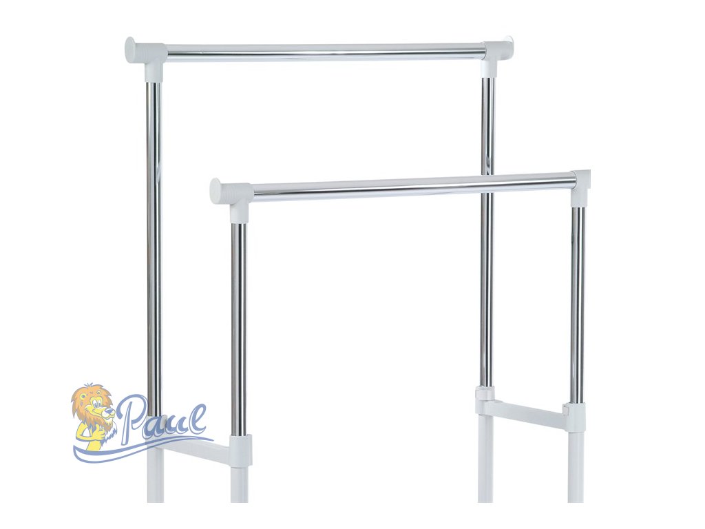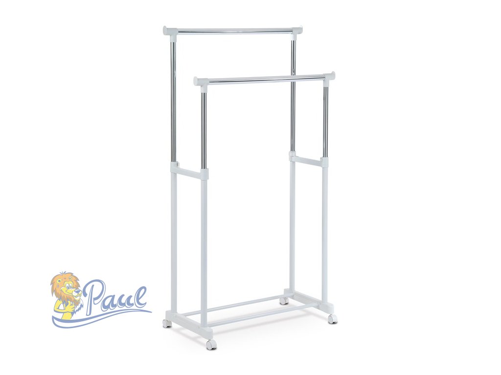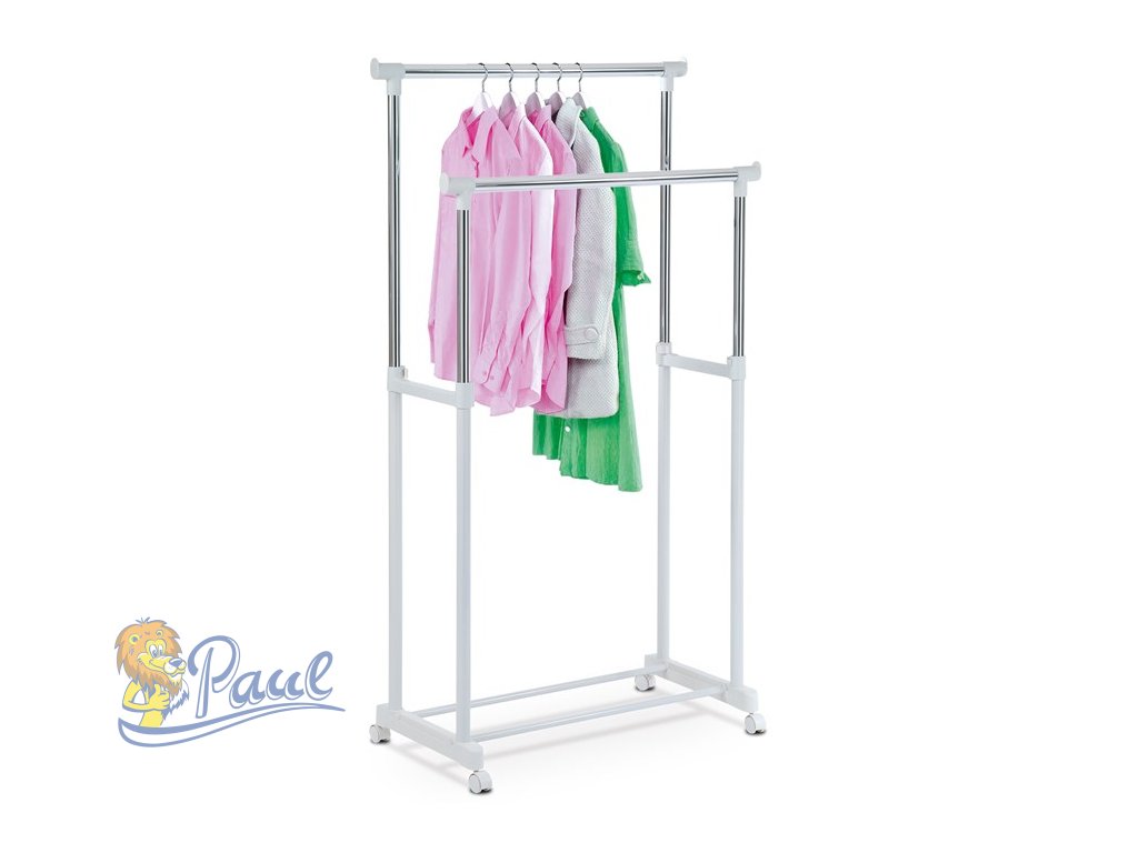 Dvojramenný stojan na šaty v bílé barvě kombinuje pevné kovové tyče s odolnými plastovými prvky a chromovanými detaily, což zajišťuje stabilitu a dlouhou životnost. Výškově nastavitelná konstrukce umožňuje přizpůsobit délku ramínek podle potřeby, což usnadňuje zavěšení různých typů oděvů. Praktický odkladač pod spodní tyčí nabízí prostor pro uložení bot nebo dalších doplňků. Stojan je vybaven čtyřmi kolečky pro snadnou manipulaci a přemístění v interiéru. Kompaktní rozměry a jednoduchý design umožňují jeho využití v domácnostech i komerčních prostorách.Doplňkové parametry
