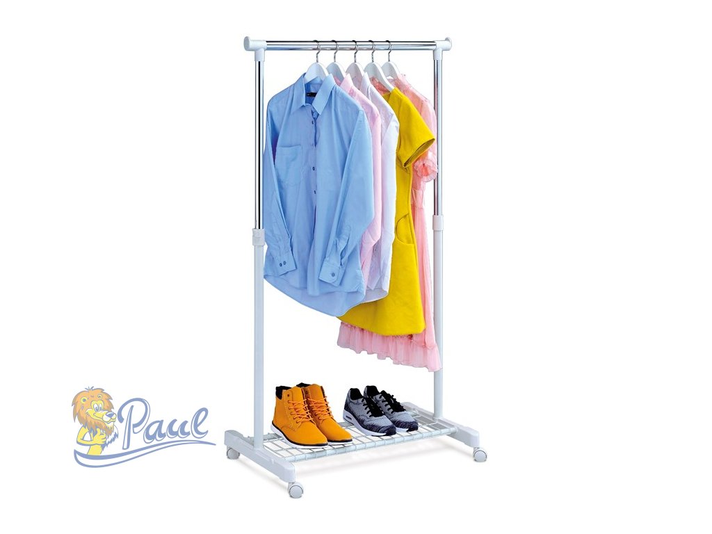 Jednoramenný stojan na šaty v bílé barvě kombinuje pevný kovový rám s plastovými prvky a chromovanou tyčí pro zavěšení oděvů. Výška stojanu je nastavitelná, což umožňuje přizpůsobení podle potřeby a různých délek oblečení. Spodní odkladač tvoří kovová mřížka vhodná pro uložení bot nebo dalších doplňků, která je součástí stabilní základny na kolečkách pro snadnou manipulaci a přesun. Kompaktní rozměry a jednoduchý design zajišťují praktické využití v domácnostech i komerčních prostorách. Nosnost a rozměry jsou optimalizovány pro běžné množství oděvů a doplňků.Doplňkové parametry