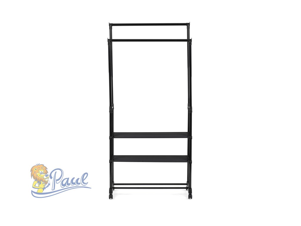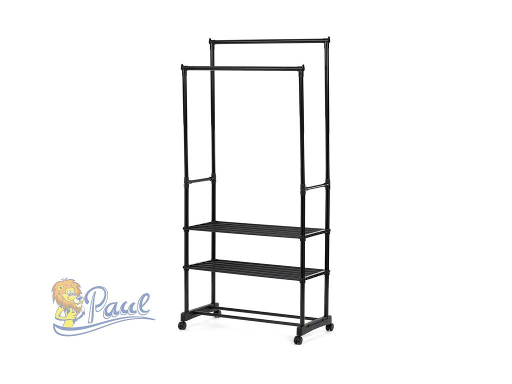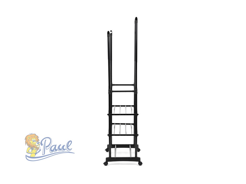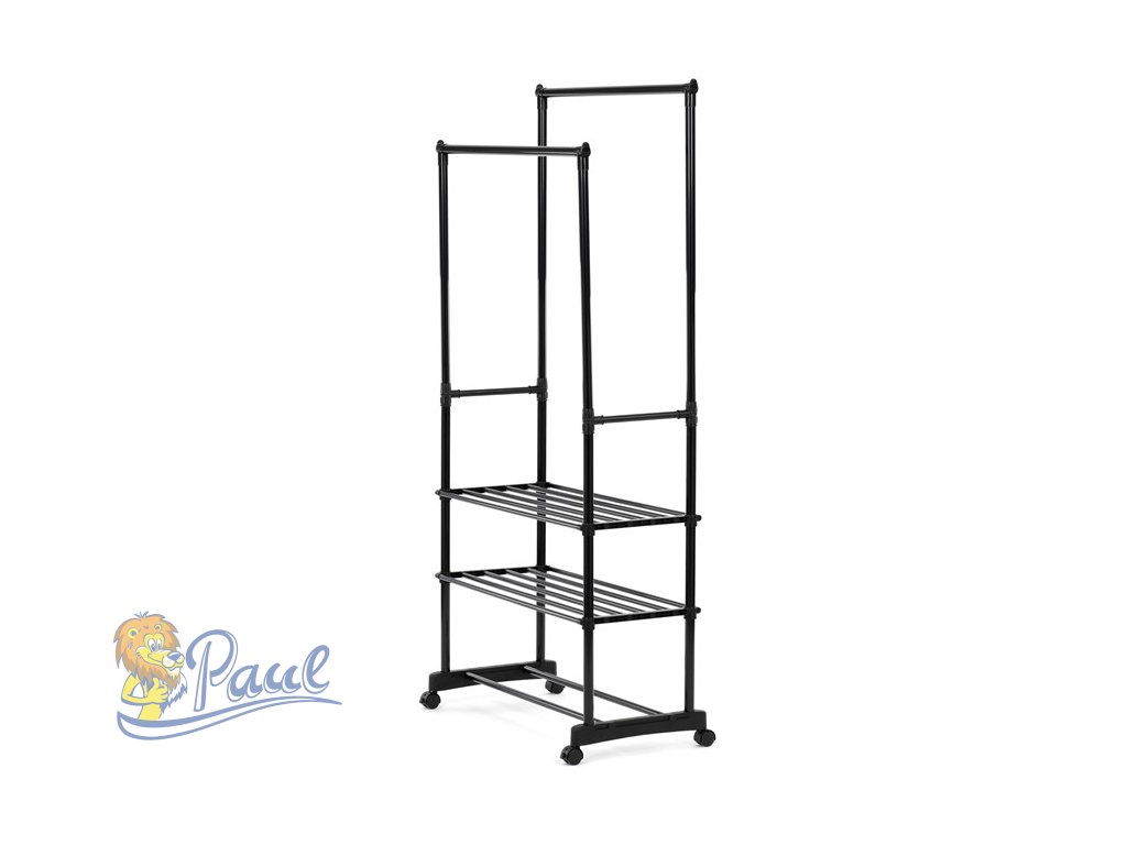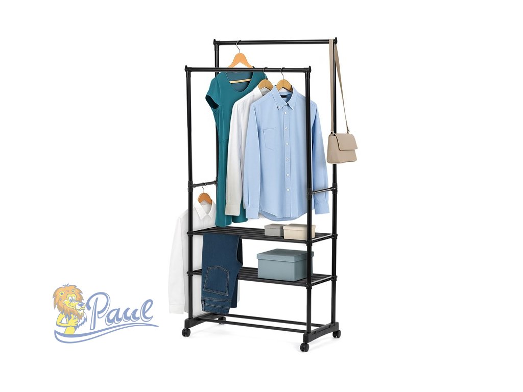 Prostorný stojan na šaty značky Autronic je ideálním pomocníkem pro organizaci vašeho oblečení. Robustní černá kovová konstrukce poskytuje stabilitu a moderní vzhled, zatímco dvě tyče na zavěšení nabízejí dostatek prostoru pro oděvy. Tři spodní police jsou perfektní pro uložení bot, krabic nebo doplňků. Stojan je vybaven kolečky pro snadnou manipulaci a flexibilitu při umístění. Praktický a stylový design z něj činí skvělý doplněk do šatny, ložnice nebo předsíně. Perfektní volba pro přehlednou a funkční organizaci.Doplňkové parametry