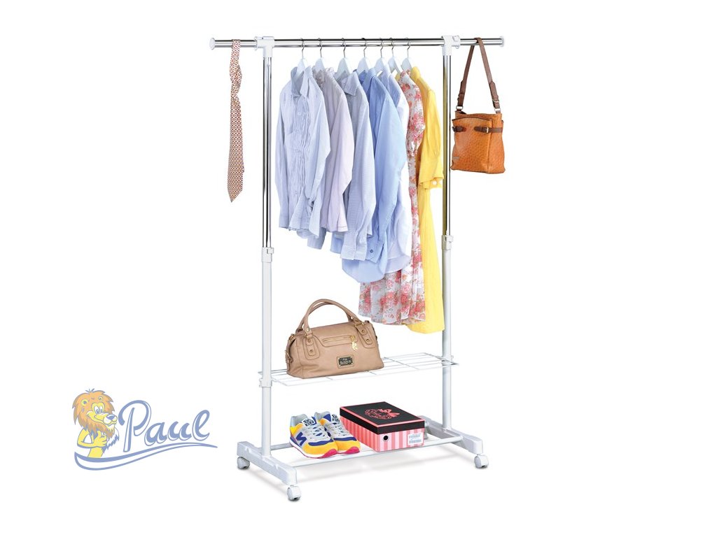 Stojan na šaty s odkladačem a poličkou v bílé barvě kombinuje pevný kovový rám s chromovanými prvky, které dodávají moderní vzhled a odolnost proti opotřebení. Výška stojanu je nastavitelná, což umožňuje přizpůsobit prostor pro zavěšení oděvů různých délek. Praktická spodní polička a odkladač poskytují dostatek místa pro uložení bot, krabic nebo tašek, čímž pomáhají udržet pořádek. Stabilní podstavec je vybaven kolečky pro snadnou manipulaci a přesun v interiéru. Díky kombinaci kovu a plastu je stojan navržen pro dlouhou životnost a snadnou údržbu.Doplňkové parametry