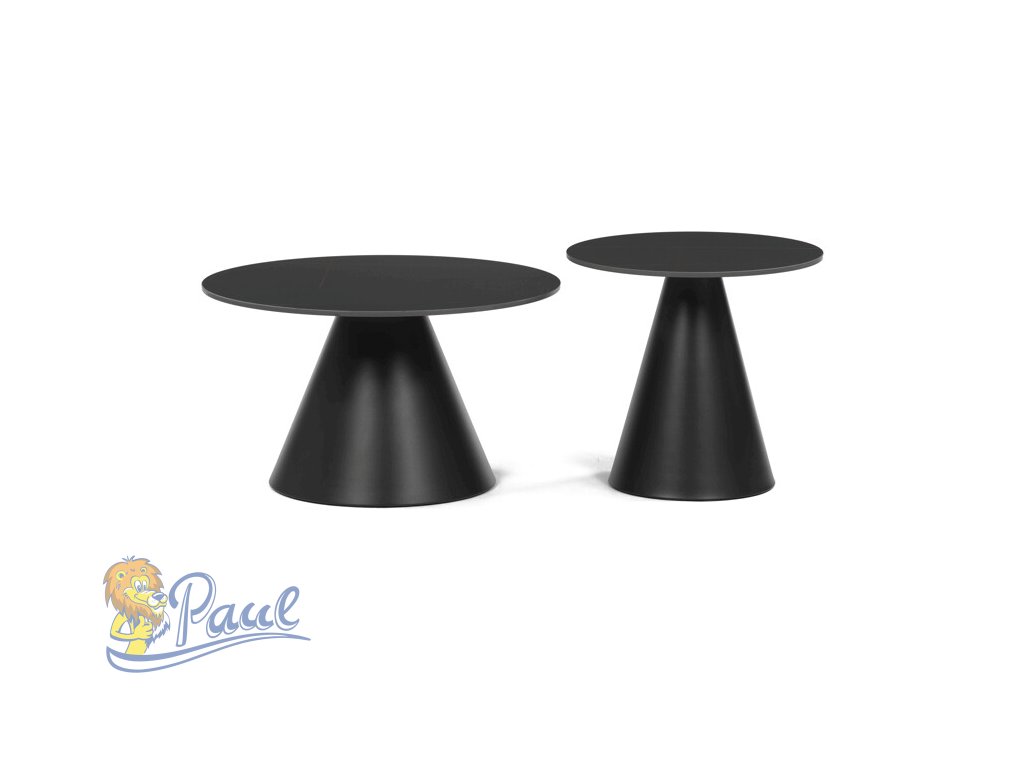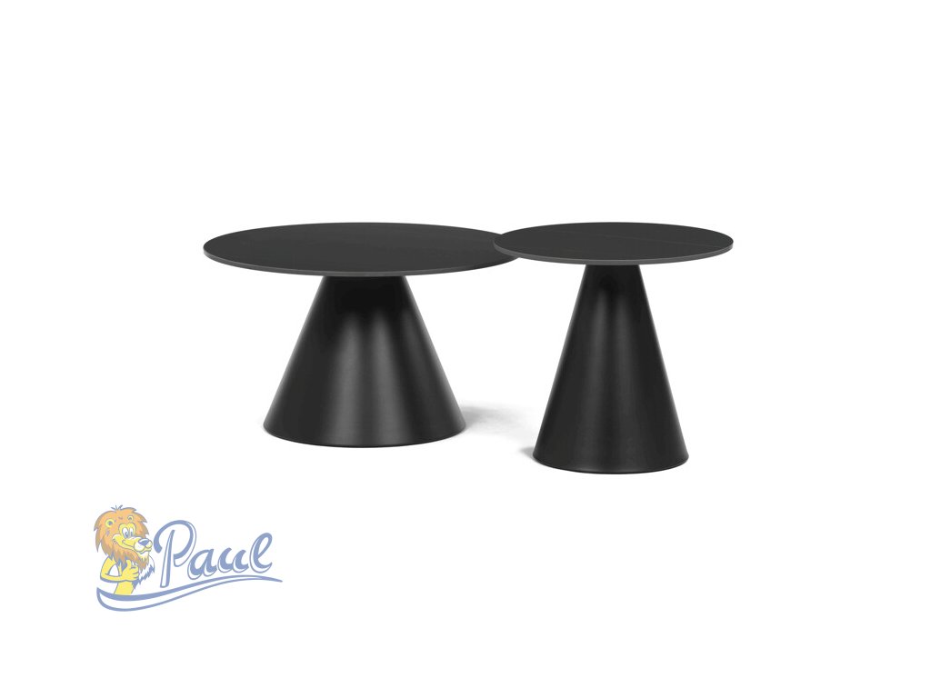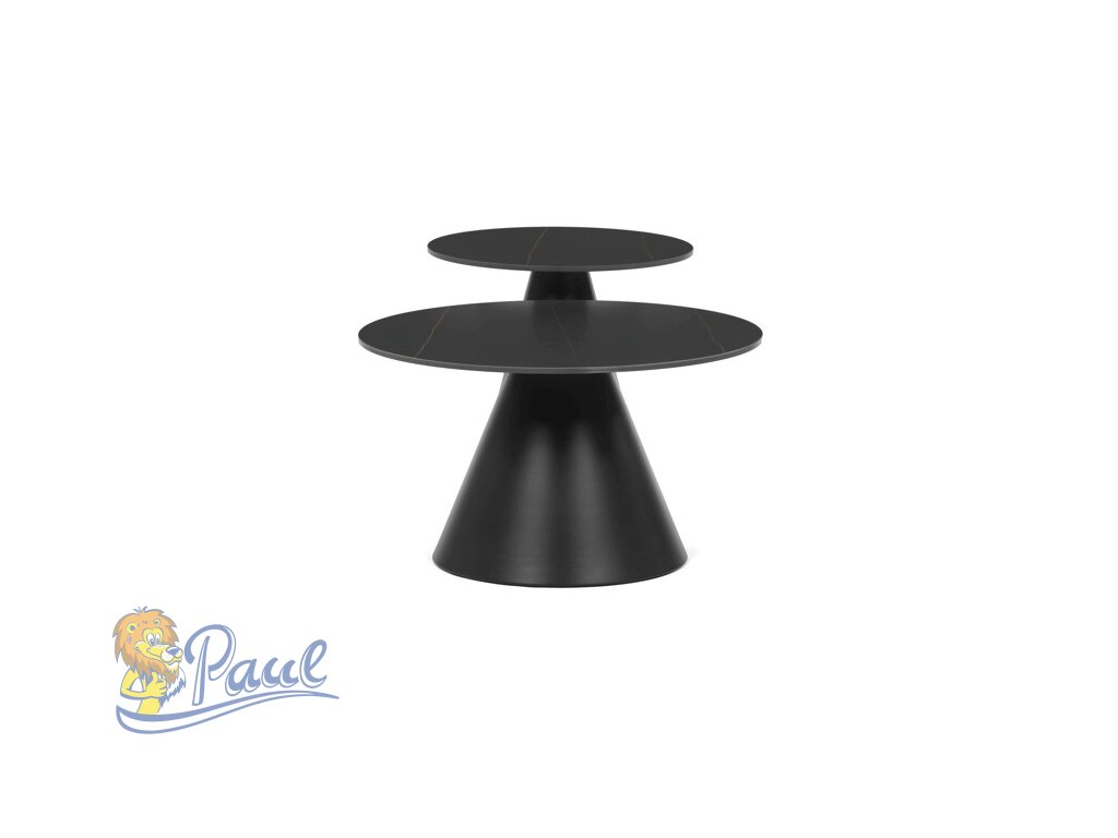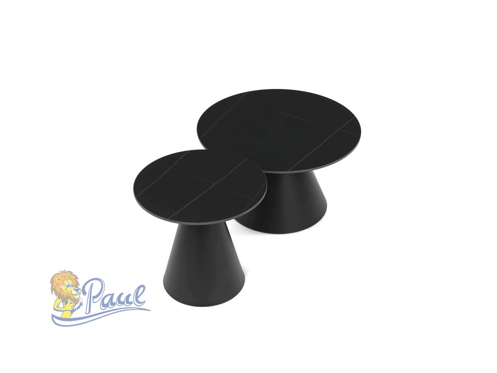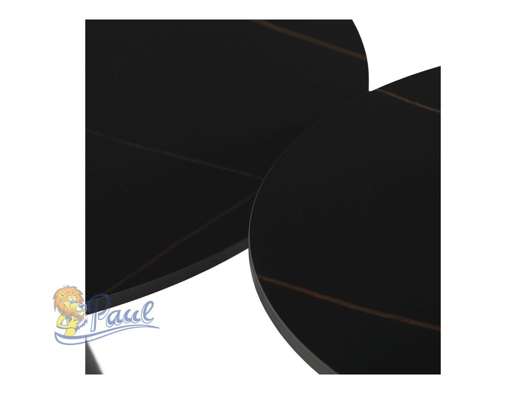 Sada dvou konferenčních stolů v moderním designu kombinuje černou keramickou desku s mramorovým dekorem a stabilní kovovou podnoží v matném provedení. Větší stůl má průměr 70 cm a výšku 40,5 cm, menší pak průměr 50 cm a výšku 47 cm, což umožňuje variabilní uspořádání v prostoru. Keramická deska je odolná vůči poškrábání a snadno se udržuje, což zajišťuje dlouhodobou estetiku i funkčnost. Kovová podnož přispívá k pevnosti a stabilitě stolů, které jsou vhodné do moderně zařízených obývacích pokojů či kanceláří. Matný povrch podtrhuje elegantní vzhled a decentní mramorový vzor dodává stolům nadčasový charakter.Doplňkové parametry