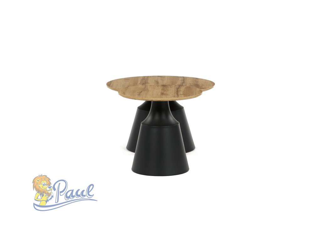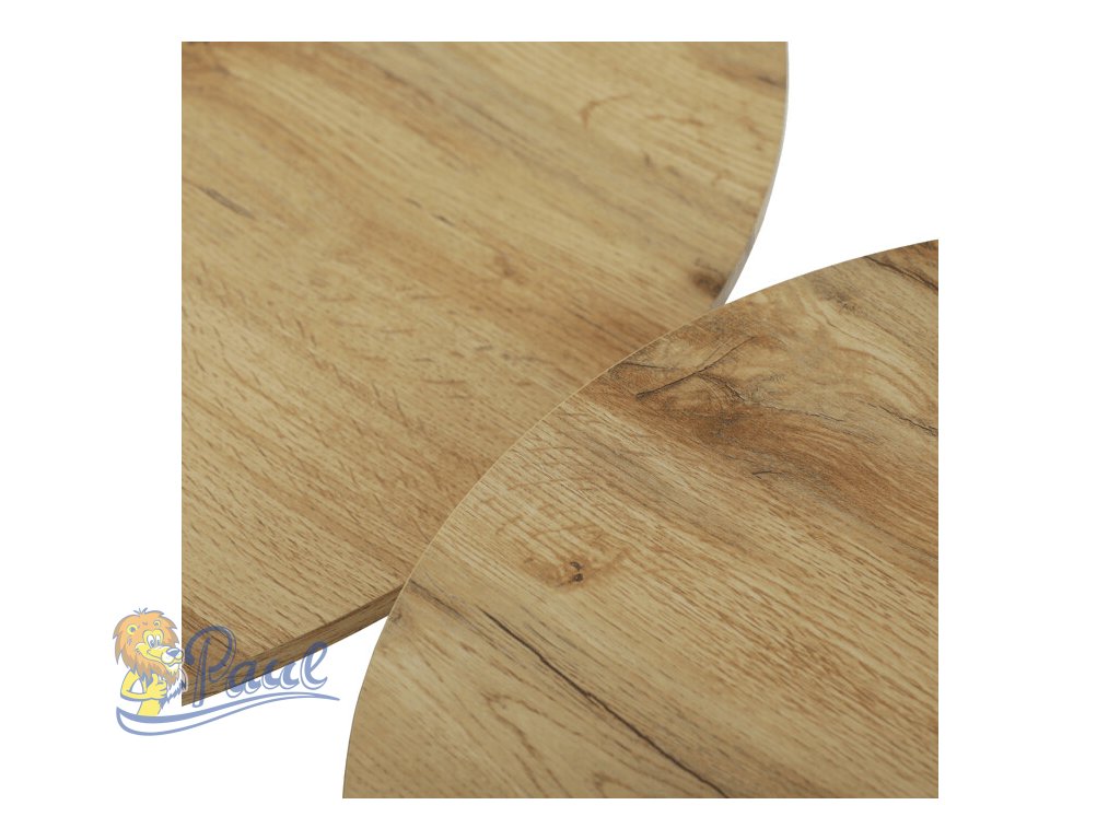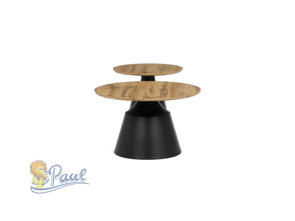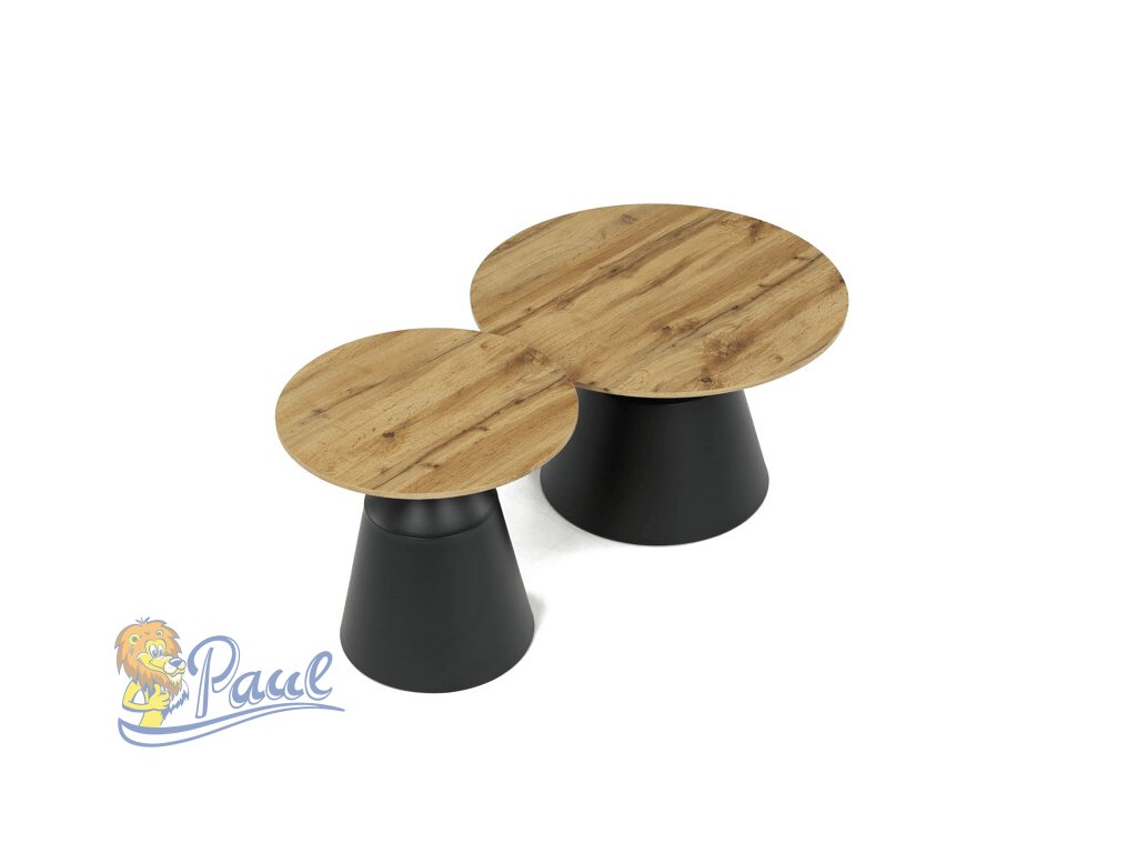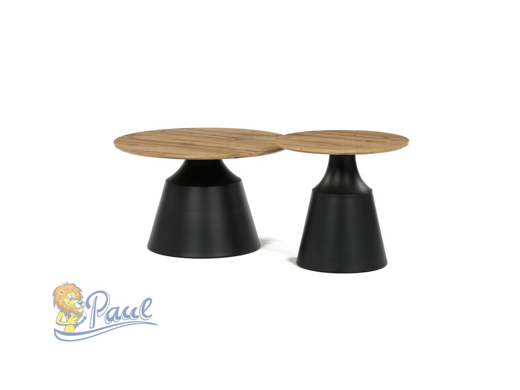 Sada dvou konferenčních stolů kombinuje desky z MDF s dekorativním povrchem v odstínu dub artisan a stabilní kovové podnože v černé barvě. Desky mají matnou úpravu, která usnadňuje údržbu a zajišťuje dlouhodobou odolnost proti běžnému opotřebení. Větší stůl má průměr 70 cm a výšku 42,5 cm, menší pak průměr 50 cm a výšku 47,5 cm, což umožňuje variabilní uspořádání v prostoru. Kovová podnož je navržena pro pevnost a stabilitu, čímž zajišťuje bezpečné používání. Moderní design s kontrastem přírodního dekoru a černé barvy se hodí do různých interiérů.Doplňkové parametry