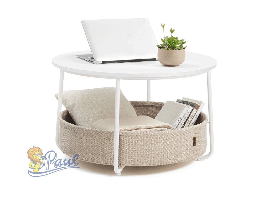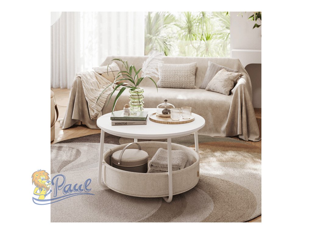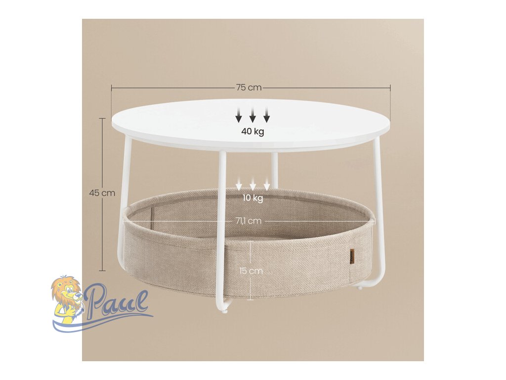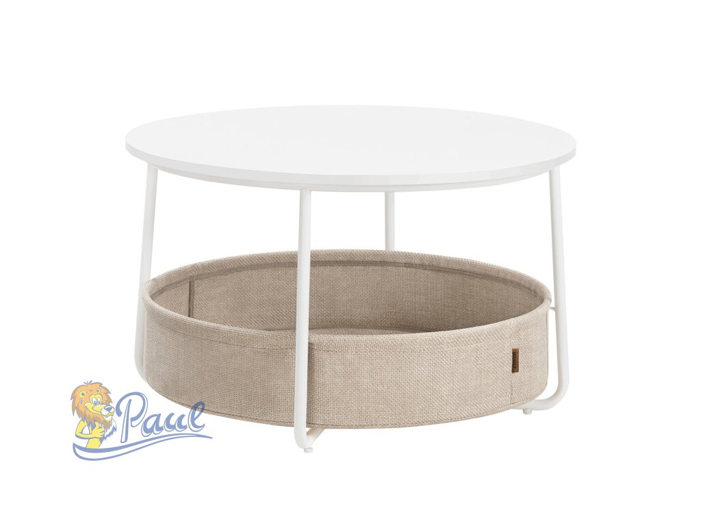 Konferenční stolek AFK-E1144 WT v moderním kulatém tvaru o průměru 75 cm a výšce 45 cm nabízí praktický úložný prostor díky textilnímu koši umístěnému pod deskou. Deska je vyrobena z MDF s bílým dekorem, který je snadno udržovatelný a odolný vůči běžnému opotřebení. Stabilní kovové nohy v bílé barvě zajišťují pevnou oporu a celkovou stabilitu stolku. Textilní koš v přírodním odstínu přidává na funkčnosti a zároveň působí vizuálně příjemně a útulně. Stolek je vhodný do moderně zařízených obývacích pokojů, kde poslouží jako praktický doplněk s dostatkem místa pro odkládání drobností.Doplňkové parametry