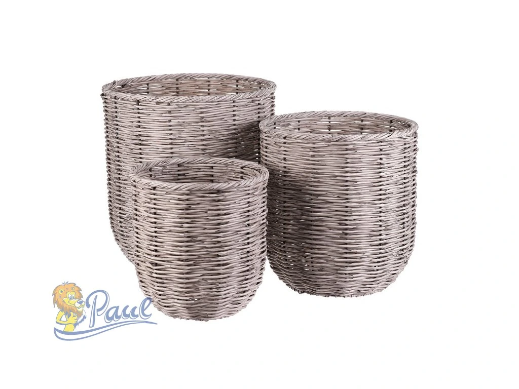 Sada tří obalů na květináče je vyrobena z umělého ratanu v šedém odstínu, který věrně napodobuje přírodní materiál a zároveň je odolný vůči povětrnostním vlivům. Každý obal má pevnou kovovou konstrukci, která zajišťuje stabilitu a dlouhou životnost. Kulatý tvar a husté proplétání polyratanu vytváří příjemný vizuální efekt vhodný do moderních i klasických interiérů. Obaly jsou vhodné pro různé velikosti květináčů a lze je využít jak v interiéru, tak na terase či balkóně. Díky sadě tří kusů je možné vytvořit stylovou a jednotnou dekoraci s praktickým využitím.Doplňkové parametry