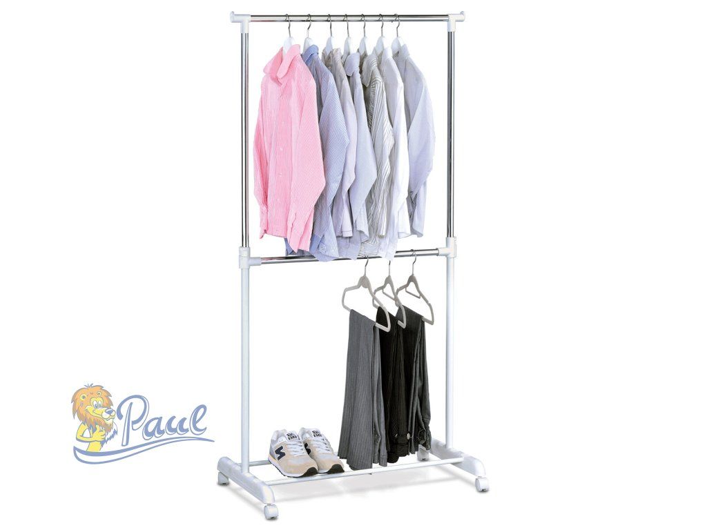 Dvojramenný stojan na šaty v bílé barvě kombinuje kovové a plastové prvky s chromovanými detaily pro moderní vzhled a odolnost. Konstrukce umožňuje nastavení výšky, což zajišťuje flexibilitu při zavěšení různých typů oděvů, od košil až po kalhoty. Spodní odkladač nabízí praktický prostor pro uložení obuvi nebo dalších doplňků, čímž pomáhá udržet pořádek v místnosti. Stabilní základna s kolečky umožňuje snadnou manipulaci a přemístění stojanu podle potřeby. Díky kvalitnímu zpracování a kombinaci materiálů je stojan navržen pro dlouhodobé používání v domácnostech i komerčních prostorách.Doplňkové parametry