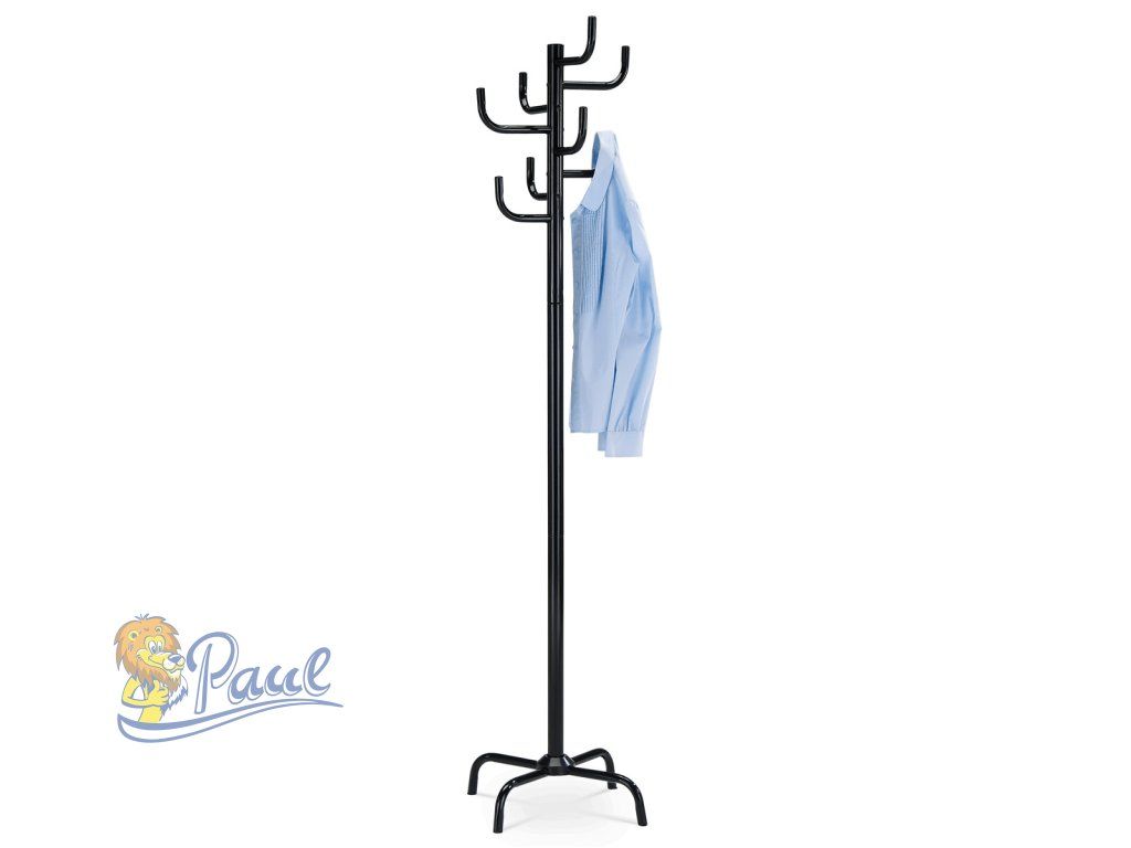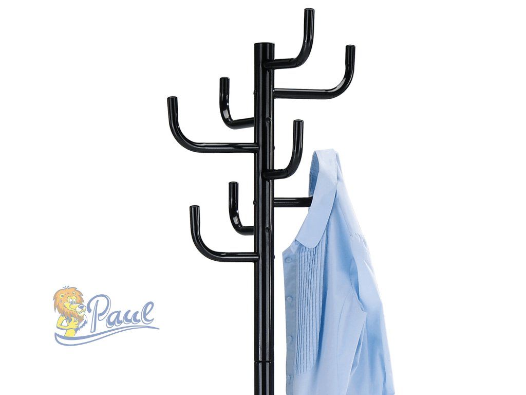 Stojanový věšák s výškou 182 cm je vyroben z pevného kovu s černým lesklým lakem, který zajišťuje odolnost a snadnou údržbu. Nabízí osm robustních háčků rozmístěných do tří úrovní, které umožňují efektivní uspořádání oděvů, klobouků či doplňků. Stabilní čtyřnohá základna přispívá k bezpečnému postavení i při plném zatížení, přičemž maximální nosnost věšáku je 10 kg. Jeho jednoduchý a funkční design se hodí do různých interiérů, od kanceláří po domácnosti, kde poskytuje praktické řešení pro ukládání svršků.Doplňkové parametry