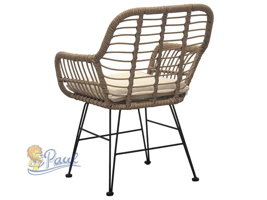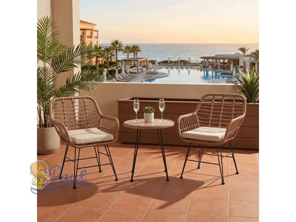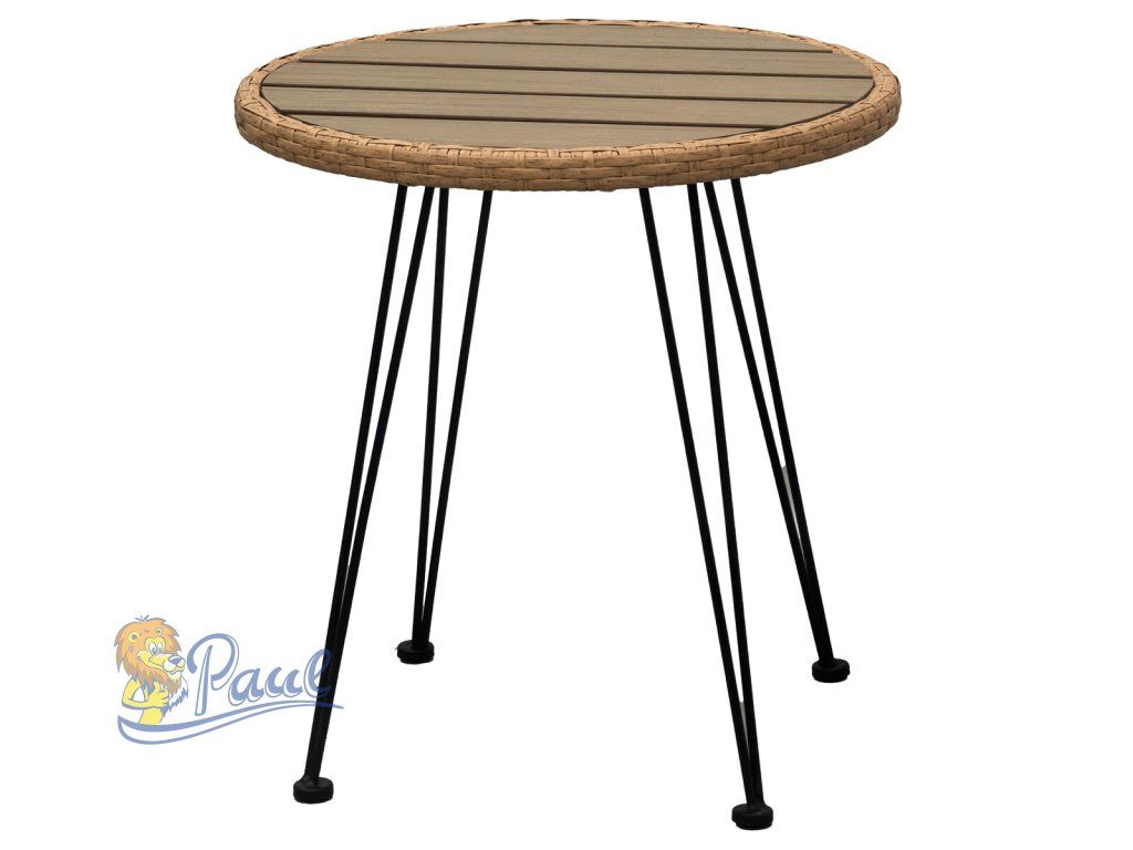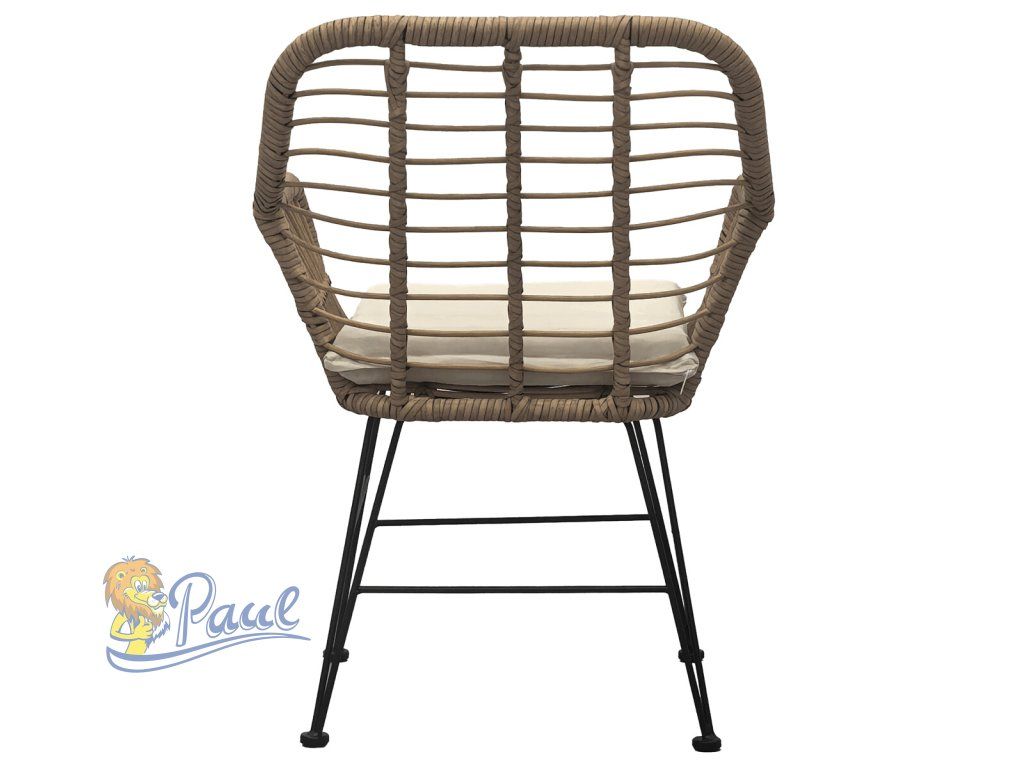 Relaxační set stůl + 2 židle, kov, umělý ratan, látka béžová, deska stolku polywood