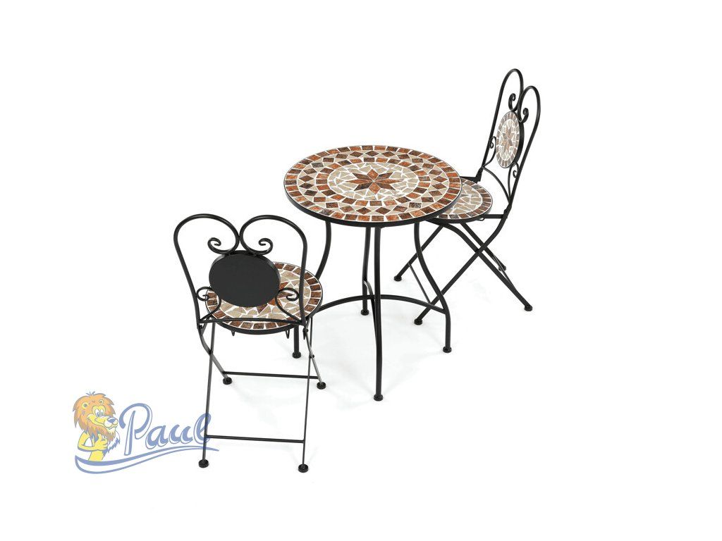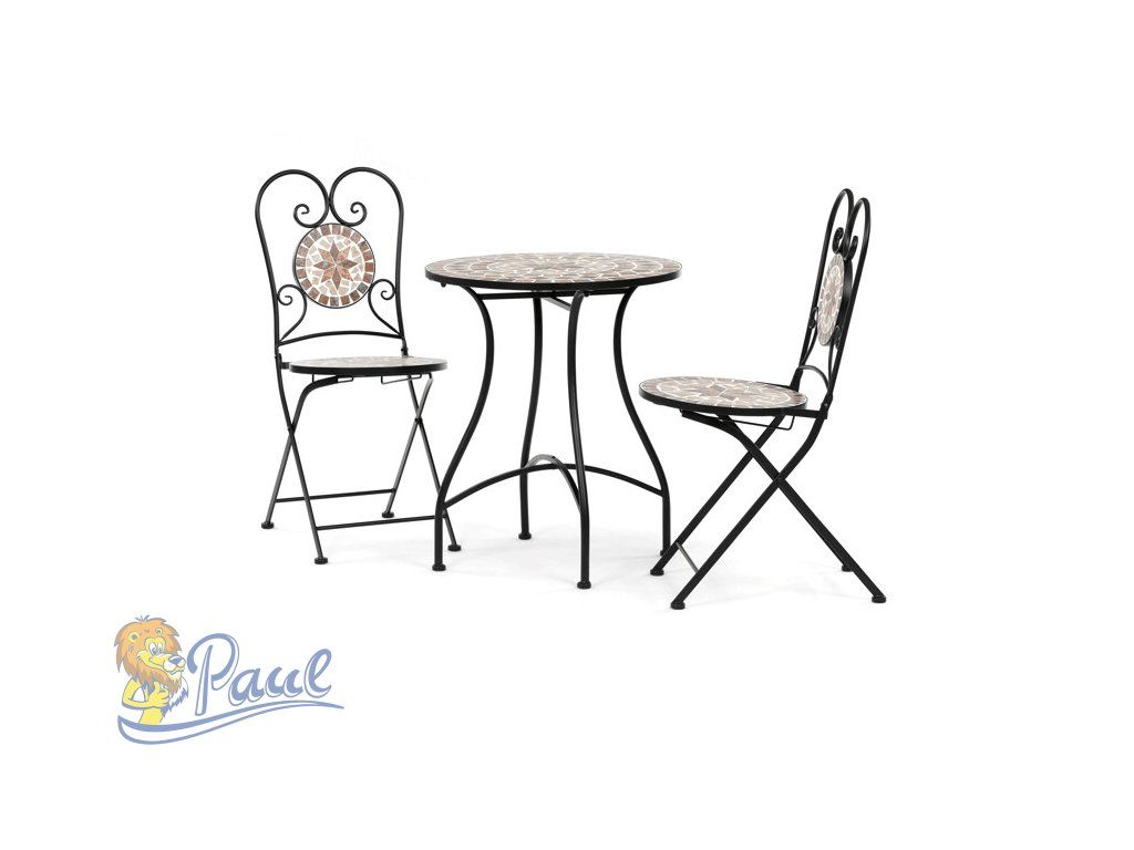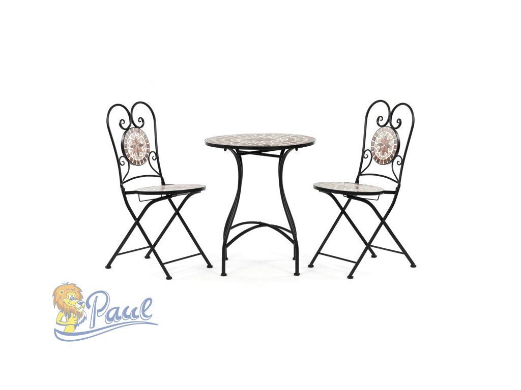 Zahradní set sestávající z kulatého stolu a dvou židlí kombinuje pevnou kovovou konstrukci s dekorativní keramickou mozaikou na deskách. Kovové nohy stolu i židlí jsou tvarované do elegantních oblouků a zdobeny jemnými kovanými detaily, které dodávají celku lehkost a stabilitu. Keramická mozaika v přírodních a teplých odstínech vytváří výrazný vizuální efekt a zároveň je snadno udržovatelná. Set je vhodný pro venkovní použití na balkónech či terasách, kde poskytuje pohodlné posezení pro dvě osoby. Díky kombinaci materiálů je navržen pro dlouhou životnost a odolnost vůči povětrnostním vlivům.Doplňkové parametry