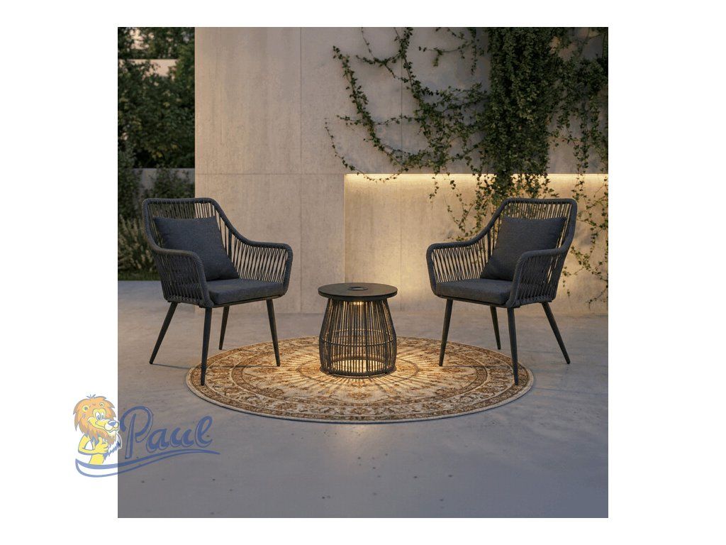 Zahradní set 1+2 v šedém provedení kombinuje pevnou kovovou konstrukci s komfortním čalouněním z látky, která je navržena pro snadnou údržbu a dlouhou životnost. Součástí setu jsou dvě pohodlná křesla s ergonomicky tvarovanými opěrkami a měkkými polštáři, které zajišťují příjemné posezení. Stolová deska je vyrobena z tvrzeného skla, které je odolné vůči poškrábání a snadno se čistí. Inovativní solární podsvícení stolku vytváří příjemnou atmosféru večerního posezení a zároveň je energeticky úsporné. Celý set je ideální pro relaxaci na terase či zahradě, přičemž jeho stabilní konstrukce zaručuje bezpečnost a nosnost vhodnou pro běžné užívání.Doplňkové parametry