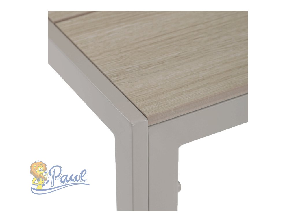 Zahradní stůl o rozměrech 150x89x73 cm kombinuje desku z polywoodu v dekoru dubu s pevnou kovovou konstrukcí v krémové barvě cashmere. Deska je navržena tak, aby byla odolná proti poškrábání a snadno se udržovala, což zajišťuje dlouhodobou estetiku i při venkovním použití. Kovová konstrukce je opatřena práškovou povrchovou úpravou, která chrání proti vlivům počasí a zvyšuje stabilitu stolu. Jednoduchý a moderní design s rovnými nohami umožňuje pohodlné usazení až šesti osob. Stůl je vhodný pro zahradní posezení, terasy i balkony, kde poskytuje funkční a stylový prostor pro stolování i odpočinek.Doplňkové parametry